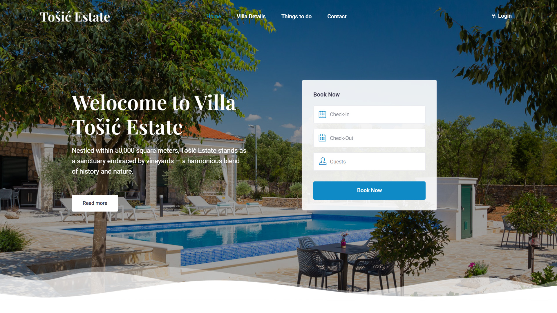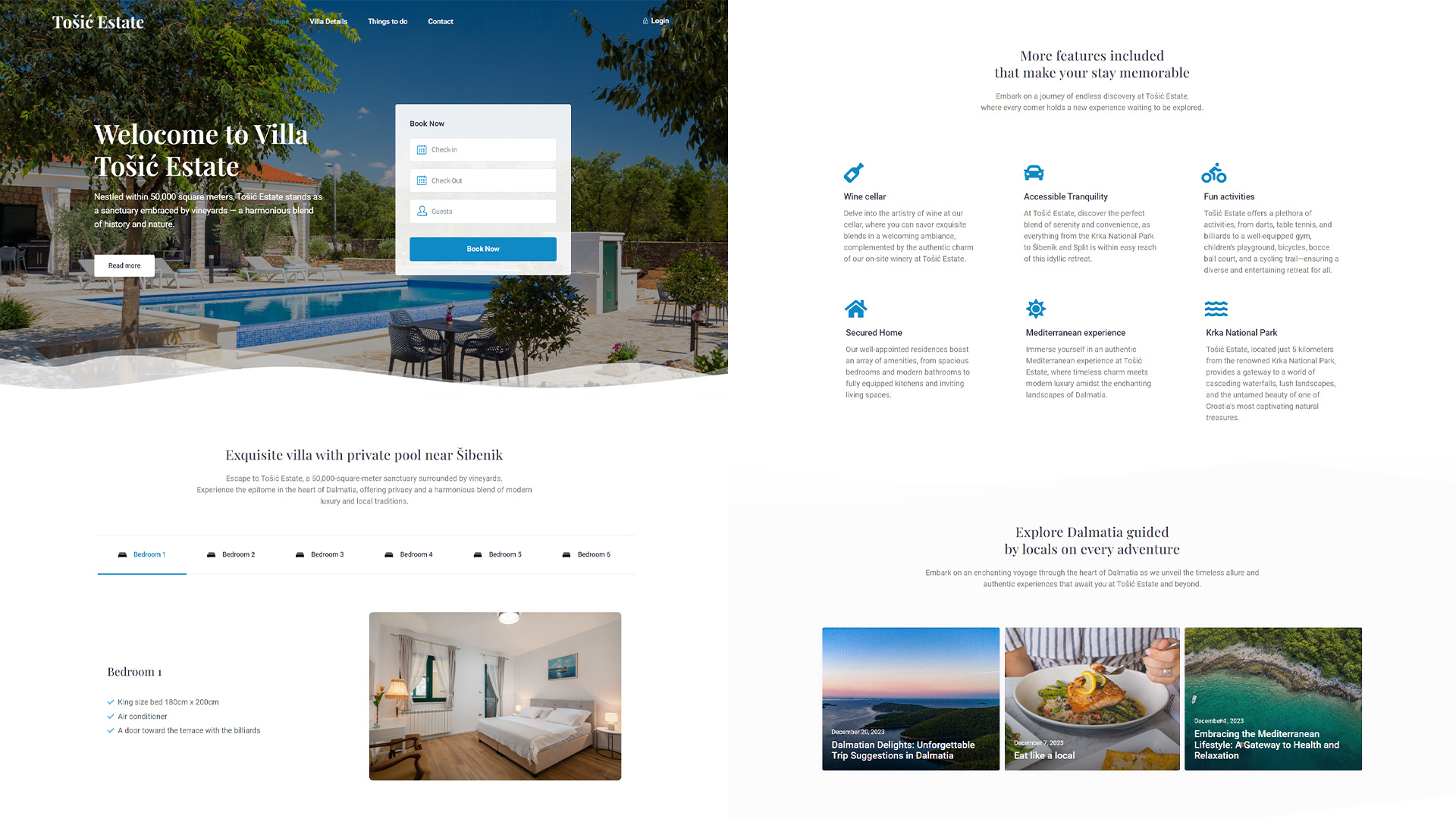 Tošić estate is a villa in Dalmatian Zagora, near the Krka waterfalls, which offers a small paradise where both young and old can have fun. We were in charge of design and development using Elementor and WordPress. The most important thing was that the site allows booking by dates and general booking management.